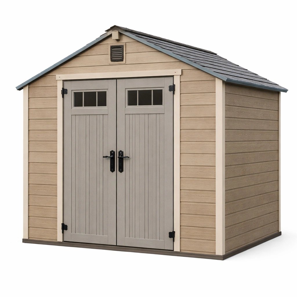 Cobertizo de jardín diseñado para almacenamiento exterior con las siguientes características detalladas: