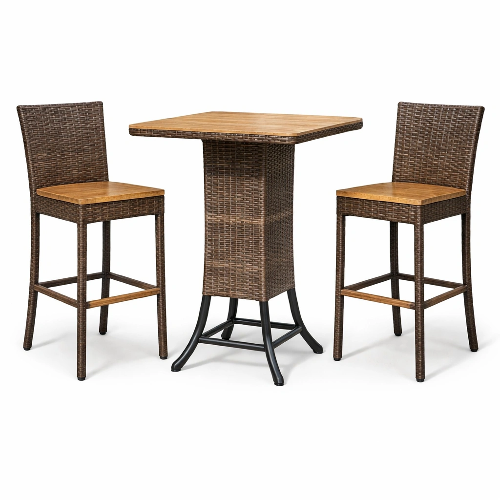 El conjunto de muebles incluye una mesa alta y dos sillas fabricadas en ratán sintético y madera de acacia.